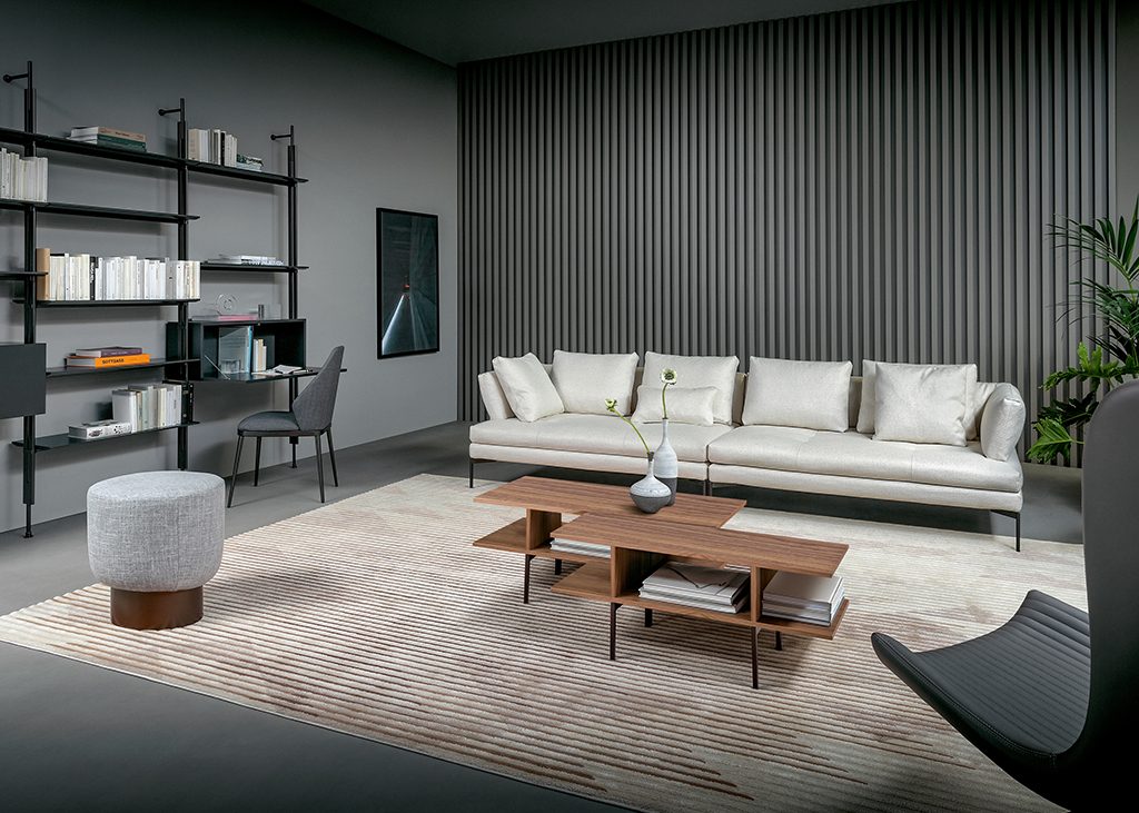 The padded top section is the same in both Belt and Cross, with no straight lines but only curved surfaces that gently complement each other, gracefully floating on their base. They are distinguished by their bases, which give each of them a distinct personality: the Belt pouf’s round metal base plays with the concept of stability, while Cross’ cross-shaped wooden base is the detail that makes this accessory immediately recognisable.