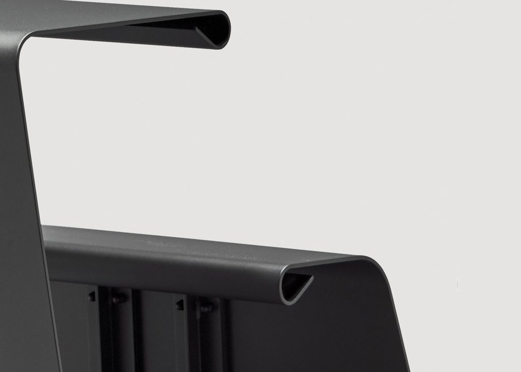 Benna system, indoor – outdoor curved metal sheet benches. The benches’ curl allows the insertion of pipes in order to link together benches, stools and bolsters, so as to create modular furniture solutions on the basis of the need. Benches and stools can also be settled as independent units. Pictured with black 7021 finish. Also available with dove grey 7039, light blue 5023, white 9016, green 2100 and red 3004 finish.