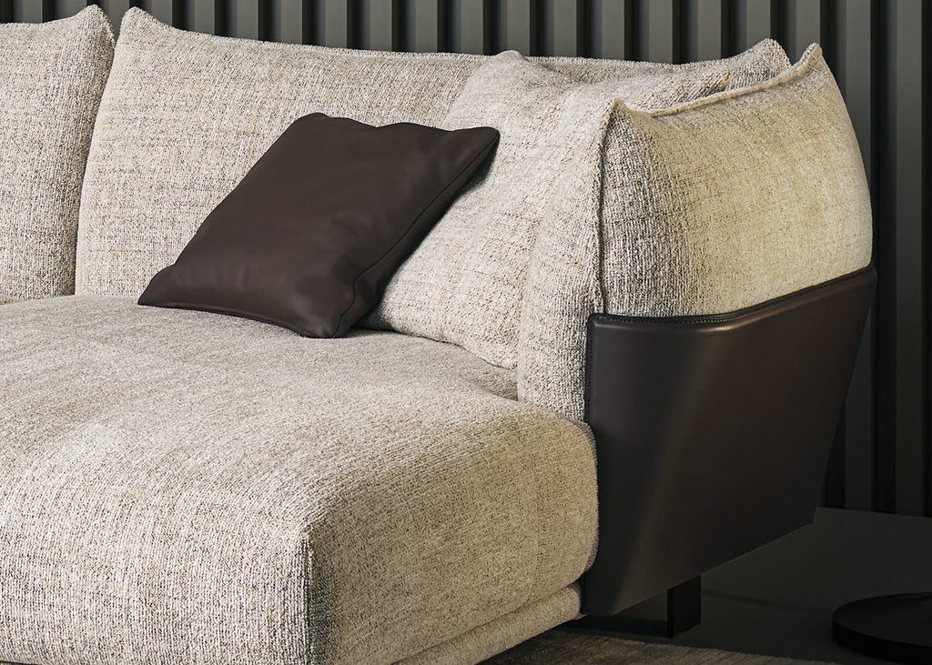 Blend is characterized by the attention to details in the processing of its composing materials: leather and fabric. The linearity of the perimeter structure covered in emery leather balances and adds value to the upholstered part, creating a rigorous line that widens upwards from the bottom, merging with a sinuous and welcoming curve that leads back inwards.