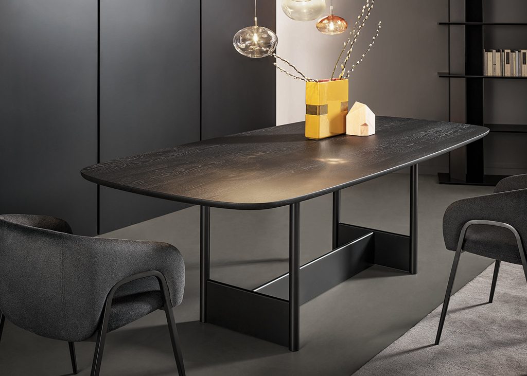 Designed by Alain Gilles, the Canvas Table stands out for its bold personality, sober lines and surprising proportions. The barrel-shaped top features generous curves and a minimal, linear design, which gives an overall sensation of continuity and fluidity. The top blends harmoniously with the base, just like a freshly painted work of art on steel easels. The architecture of the base, rigorous and at the same time unexpected, sees all the metal elements converge and connect to form a solid but never bulky structure. The result is a table with distinctive harmony that transmits a sensation of lightness, through a design that aims to challenge conventions and transform the perception of the visual weight of this piece of furniture.