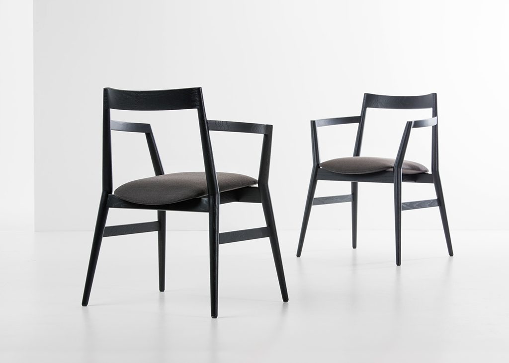 We have reinterpreted the traditional typology of a wooden chair with armrests using a characteristic 'break' in the geometry of front legs. Rounded geometry of turned armrests and the backrest is mirrored in the lenticular cushions. Primarily functional intersection between the legs and transversal bars on the seat maintains geometrical exactness. Intersections between the backrest and armrests, perceptible by touch, were created according to the principles of organic transformation of volume. Those contrasts between 'soft' and 'hard' elements and intersections shape the Dobra's characteristic formal language.