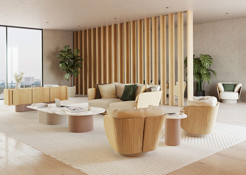 Dune is a collection of sideboards, coffee tables, armchairs, and rugs that create an atmosphere suitable for any project, whether in a home or a contract setting. It is characterized by its sculptural feet inspired by desert dunes, creating ridges that can be lacquered in different colours. It stands out for its natural oak wood with sinuous and rounded shapes that give a very sophisticated and elegant effect. It is a collection where Monica Arnani has sought to combine elegance, freshness, and sophistication.