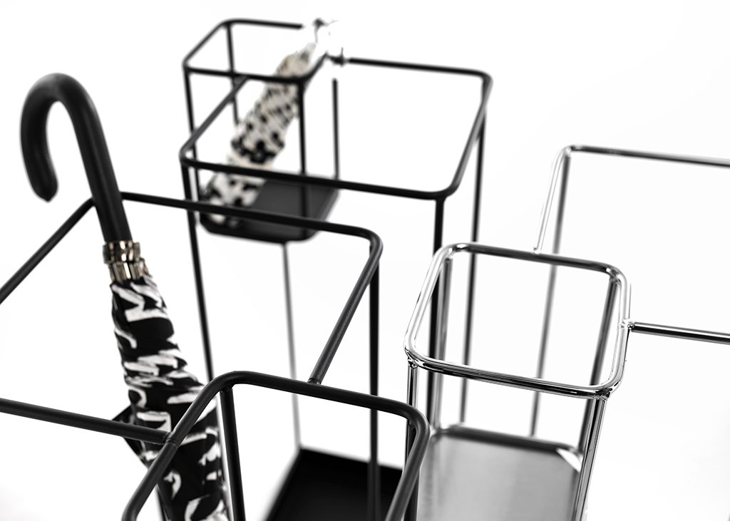 Duo is an umbrella stand made of black painted metal. It is a useful accessory with simple lines where you can place both the classic umbrella and the folding one.
