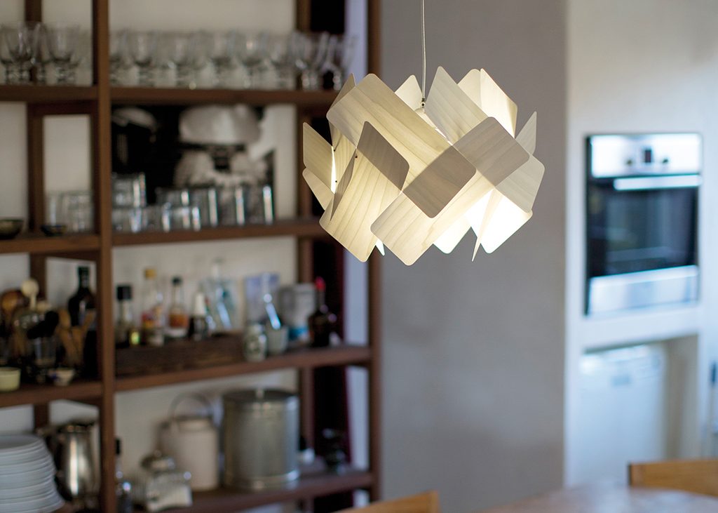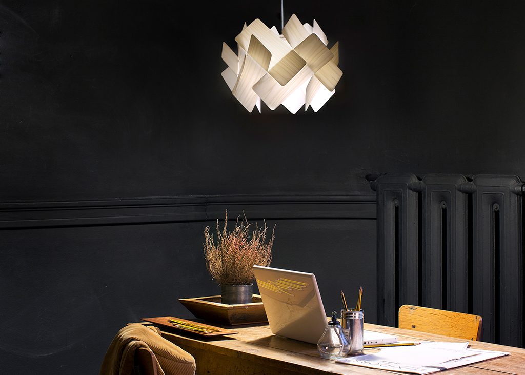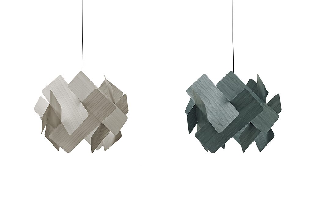 Escape is an avant-garde pendant with a smart domino-like structure. Its self-supporting veneer panels give the impression of falling into a ring of light, their form defying gravity.