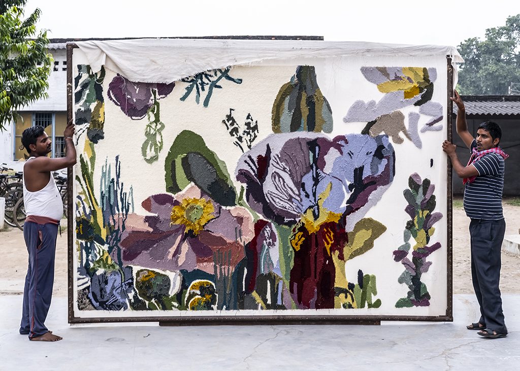 Backyard is a literal representation of one of Moix's works, in which the original piece has been transferred as reliably as possible to a rug. Its name refers to the natural space behind a house, where the flora is wilder. Hence it is a mural with a messier approach where flowers are presented on a spectacular scale. Its lines in low relief reflect the pencil sketches of the painting.