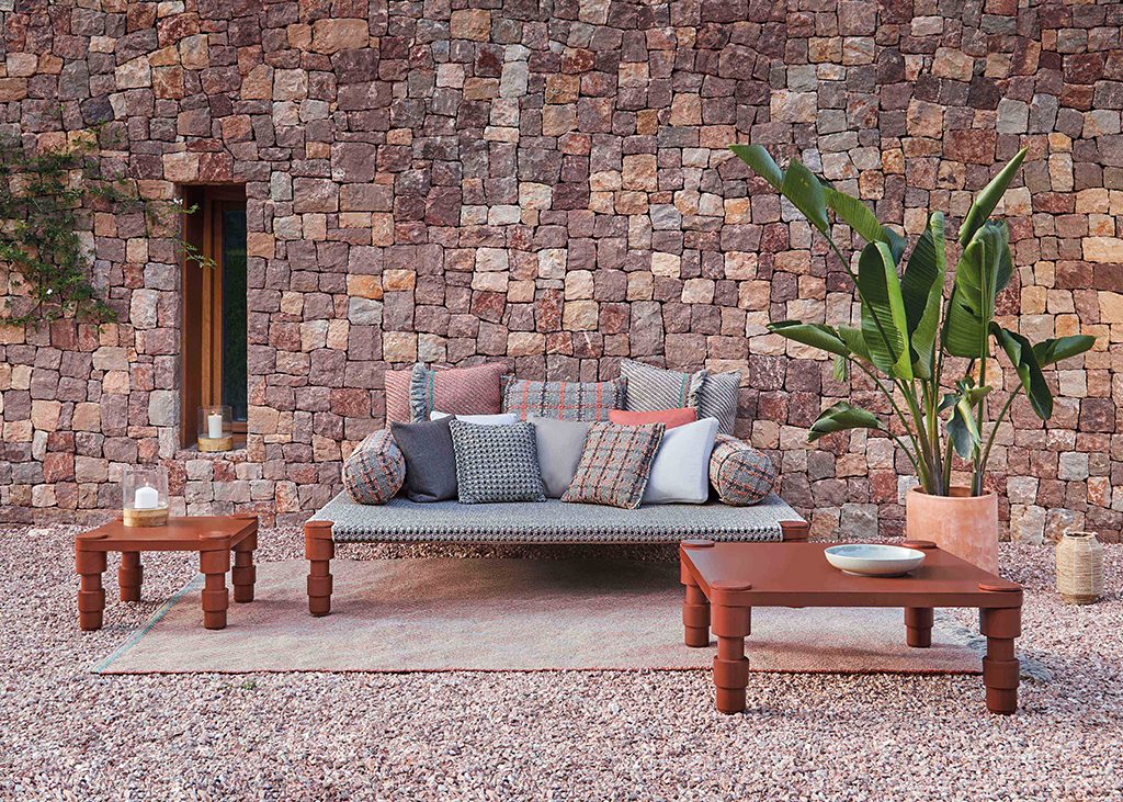 The Garden Layers collection, designed by Patricia Urquiola and inspired by Mughal architecture and culture, includes a wide range of carpets, mattresses, side tables, daybeds, rolls and cushions. Its innovative fabrics and fillings are designed specifically for outdoor use, while maintaining the comfort typical of indoor spaces.