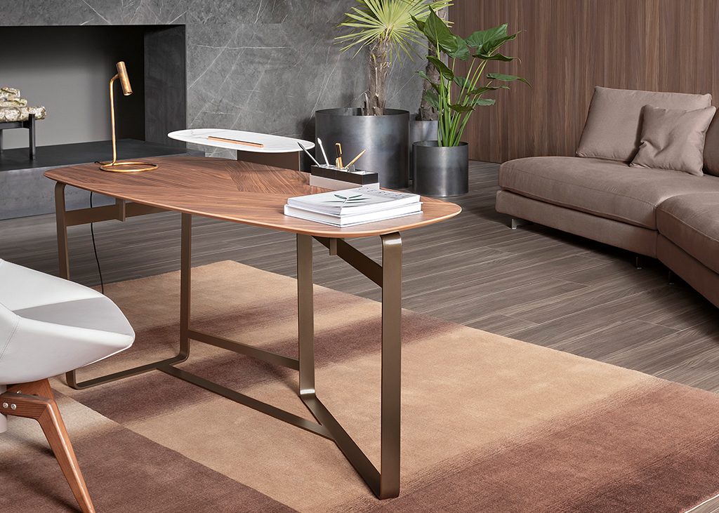The geometric Gauss desk features a curved, fluid top with no sharp edges, much like the legs, which take on the appearance of metal rings with rounded corners. The distinguishing feature of Gauss is the raised section, which creates a second level for the desk. In addition to the main desk top in wood, Gauss can also offer a practical “floating” shelf made from ceramic, which is attached to the main desk via two metal bars. The other unique detail to Gauss is the shape of the legs, which stand in a dynamic, asymmetrical position, creating an irregular structure which lends a youthful, casual quality to the desk. In addition, the veining in the wood of the desk top adds dynamism, increasing the aesthetic impact of Gauss.