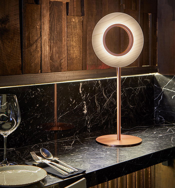 A versatile all-rounder, Gea is a solid and circular suspension, ceiling, wall and floor lamp (named ‘Cosmos’). Designed by Mariví Calvo, Gea’s modest form is smart, self-possessed and clean-cut. A steadfast performer, Gea radiates warmth from its wood veneer sides, the resulting effect satisfyingly serene.
