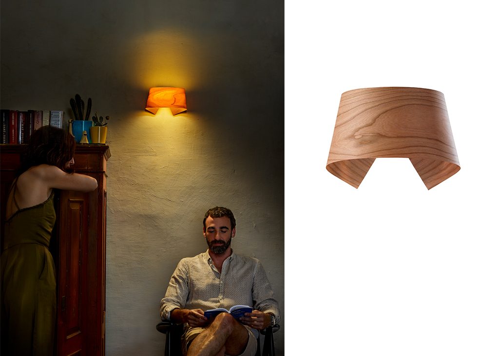 Inspired by the traditional stiff shirt collar of old, Ray Power designed the Hi-Collar wall light. This small and simple lamp casts an indirect light in subdued tones both upwards and downwards, while the single piece of bent wood veneer diffuses a warming glow.