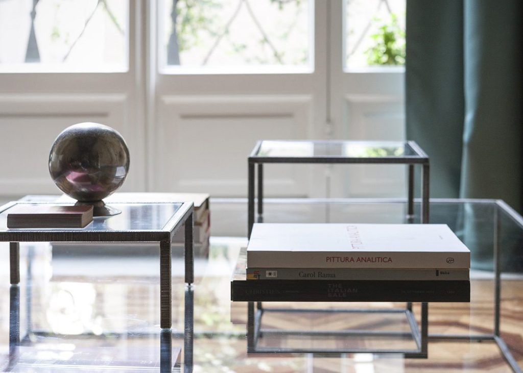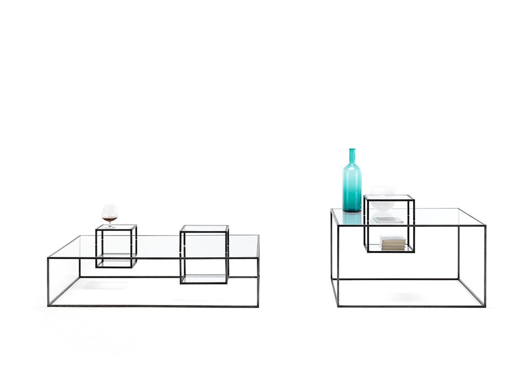 Illusioni is a coffee table with black iron structure and transparent crystal tops. The volumes seem to fluctuate as in the absence of gravity; the slender structure establishes its light and essential line.