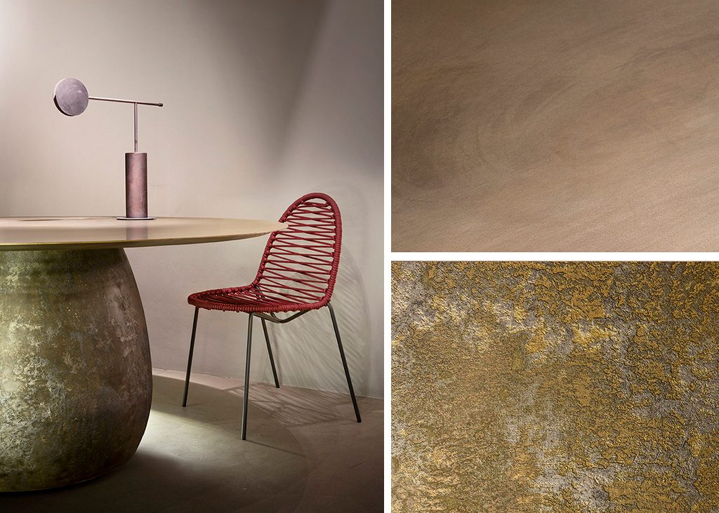 Top and base made of metal which is worked with a metal lathe. Fine finishing by Da a: an old and natural technique of the manual application of brass and bronze.