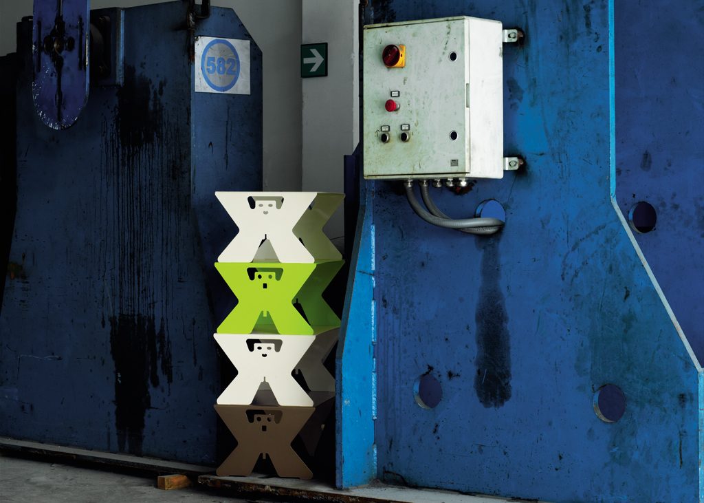 Io/Te, indoor-outdoor table made of laser-cut sheet metal. Pictured with otago white frame and sides with sinop red, San Francisco blue and tikal green finishes. Also available with side with anodic bronze finish.