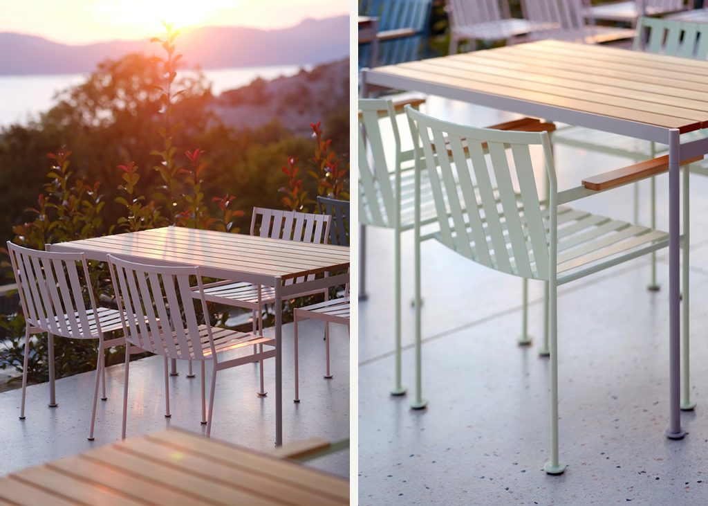 The Jugo outdoor collection is reminiscent of the Mediterranean laid-back spirit evoking the need for hedonism. The collection is designed to contrast the rational and almost ascetic powder coated construction made of stainless steel to the oversized wooden armrests and lavish cushions. The seat and the backrest are inclined at an angle that provides high-level ergonomics in the seating position. The solid wood armrests of both the Jugo easy chair and sun lounger are characteristically wide. Their width almost matches the dimensions of the tray tables that can be used for putting away a glass with your favourite drink. This feature gives the easy chair a very specific, relaxing and lavish trait. All surfaces for tables and low tables are made from wooden and metal slates, selected as durable materials that mature gracefully. Distinctly accentuated discs on the legs are another characteristic design feature whose function is to ensure various modalities of use on soft or sandy surfaces. The name of this outdoor collection has been inspired by "jugo" – a characteristic wind blowing from the southeast, also known as the wind of 'fjaka' that literally translates to "doing nothing".