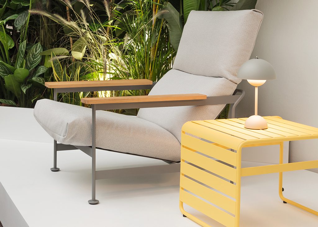 The Jugo outdoor collection is reminiscent of the Mediterranean laid-back spirit evoking the need for hedonism. The collection is designed to contrast the rational and almost ascetic powder coated construction made of stainless steel to the oversized wooden armrests and lavish cushions. The seat and the backrest are inclined at an angle that provides high-level ergonomics in the seating position. The solid wood armrests of both the Jugo easy chair and sun lounger are characteristically wide. Their width almost matches the dimensions of the tray tables that can be used for putting away a glass with your favourite drink.