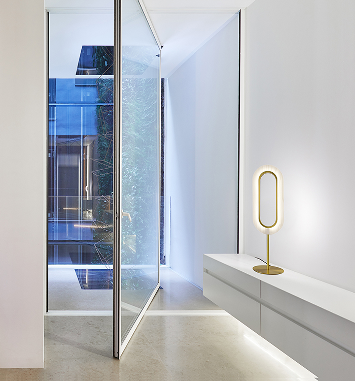 A metal mushroom-like appendage reflects light onto the panel, which in turn quietly illuminates the surrounding space. An angled metal arm connects the panel to a cylindrical marble base.