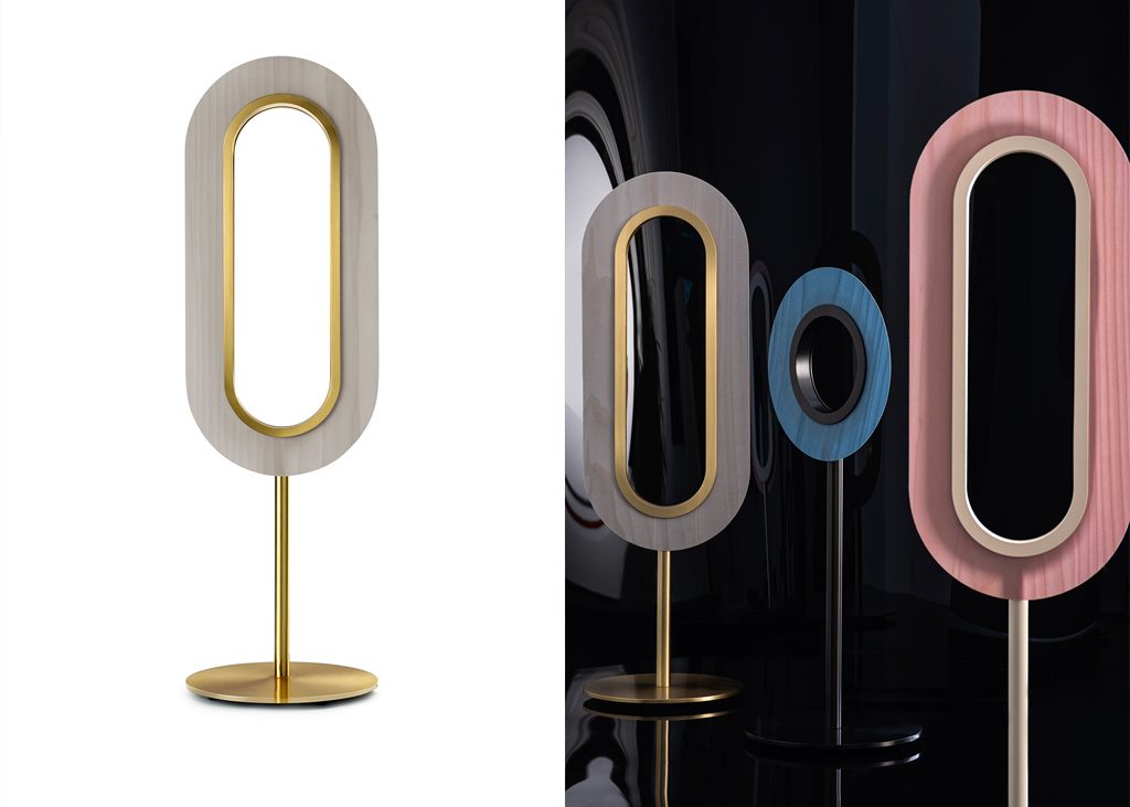 Designed by MUT, Lens enjoys flowing lines with no hard edges. Its wood veneer shade surrounds an oval circumference of light, and in its centre is a clear void. The shade is connected to a slender metallic base that comes in four colours, gold, white, black or copper.