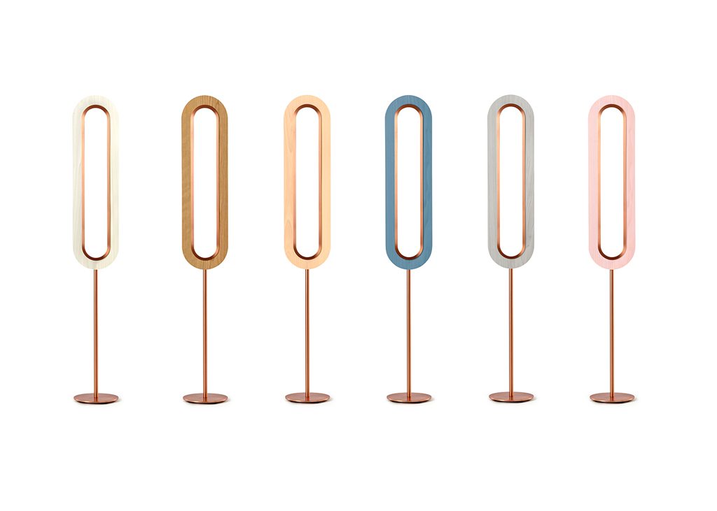 Designed by MUT, Lens enjoys flowing lines with no hard edges. Its wood veneer shade surrounds an oval circumference of light, and in its centre is a clear void. The shade is connected to a slender metallic base that comes in four colours, gold, white, black or copper.