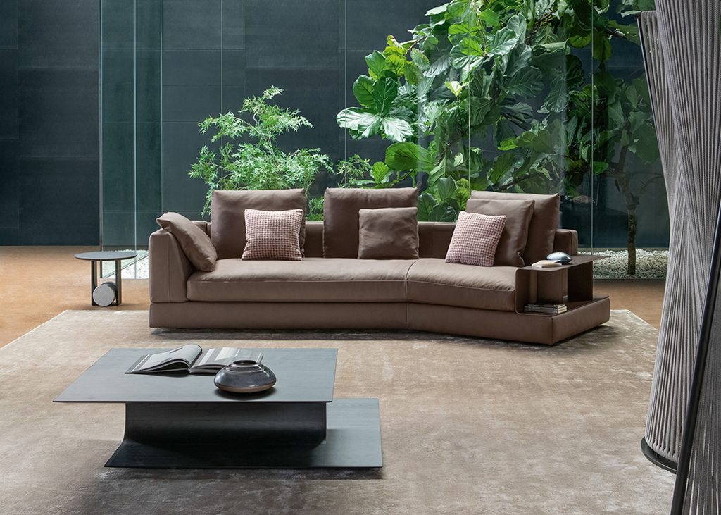 With a rigorous, formal and essential style based on primary geometric shapes, the Liam sofa makes functional versatility and ergonomics of use its outstanding characteristics. By harmonizing with other furnishing accessories, Liam is able to create countless interior design configurations for interpreting the most disparate styles of contemporary living, both in the home, hospitality contexts and reception areas. Liam is available both in a linear version and with curved elements to create even more defined and intimate spaces. The sofa is produced with sartorial care in every detail, such as the painted metal feet, the magazine holder armrest and the leather tray table, offered in a range of sophisticated colours.