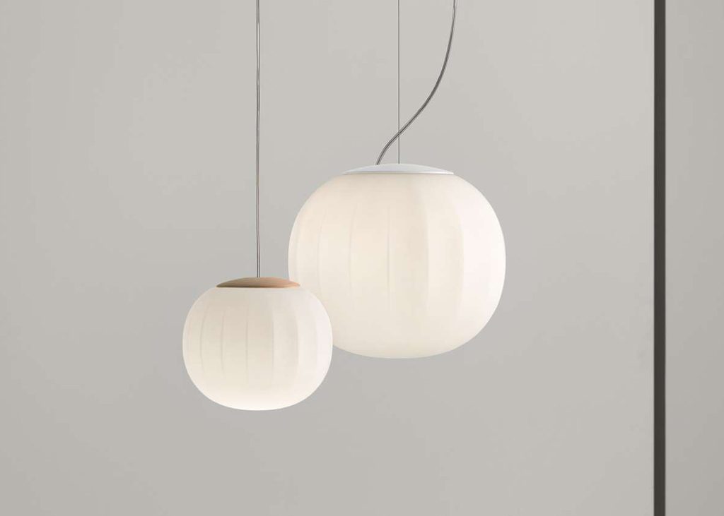 The diffuser in opaline blown glass – whose surface is scanned by the repetition of slight vertical cusps that vanish at the extremities – is combined with a wooden structure, making Lita a product with a forceful material character. A timeless and evocative object that combines the crafts tradition with technical research, seductive in its way of matching visual and tactile sensations.