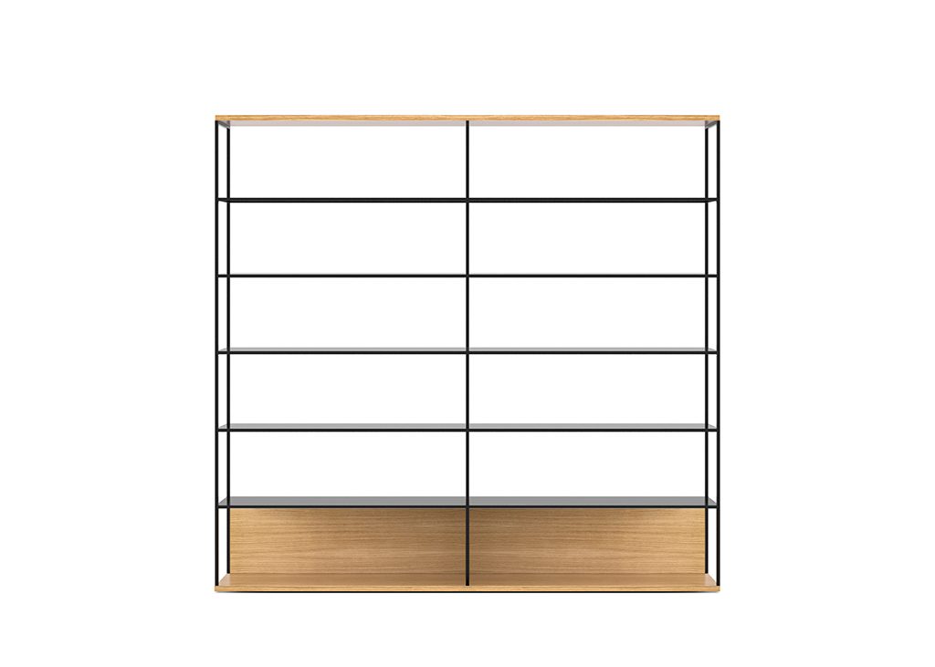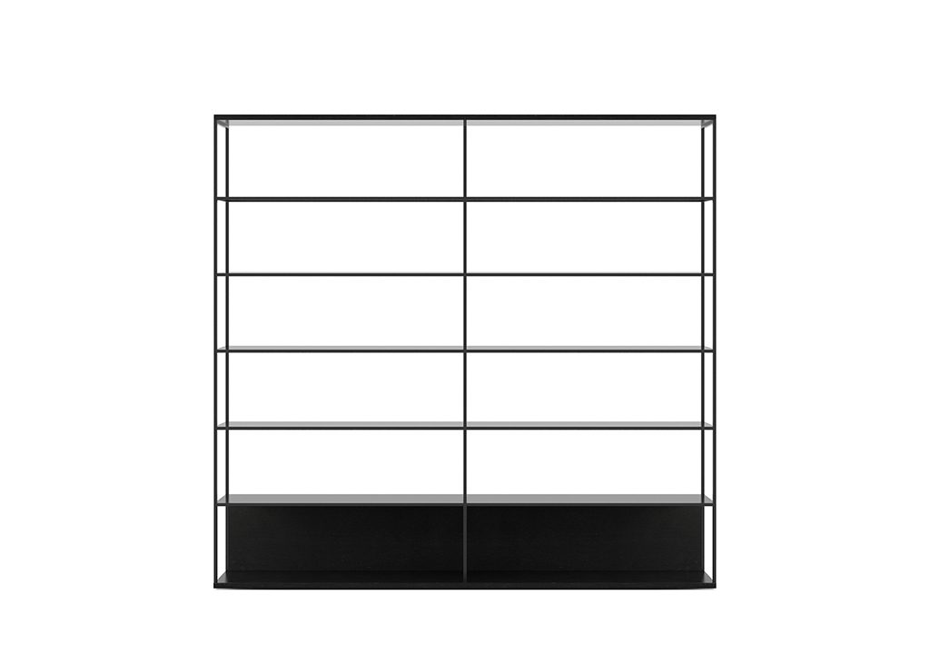 integrating into all kinds of architecture and interior design works. In this version, OPEN, designed in 2014, the volumes are transparent and even lighter, so they can hold containers and be used as room partitions. Fixed shelves. Base on adjustable feet.