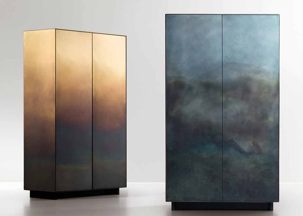 The traces of time are drawn one on top of another, infused into the changing skin of the rigorous metal forms that define these cabinets and chests. Like the tide (marea in Italian) leaves its mark, wave after wave, even here the hand of the craftsman has left its sign, oxidation after oxidation, creating a painterly effect that resembles water’s erosion of the material. Somewhere between design object and work of art, each piece in the collection, composed of a chest of drawers, low credenza and cabinet, is unique thanks to an entirely hand-crafted finish that transforms the metal surface into a delicate watercolour.