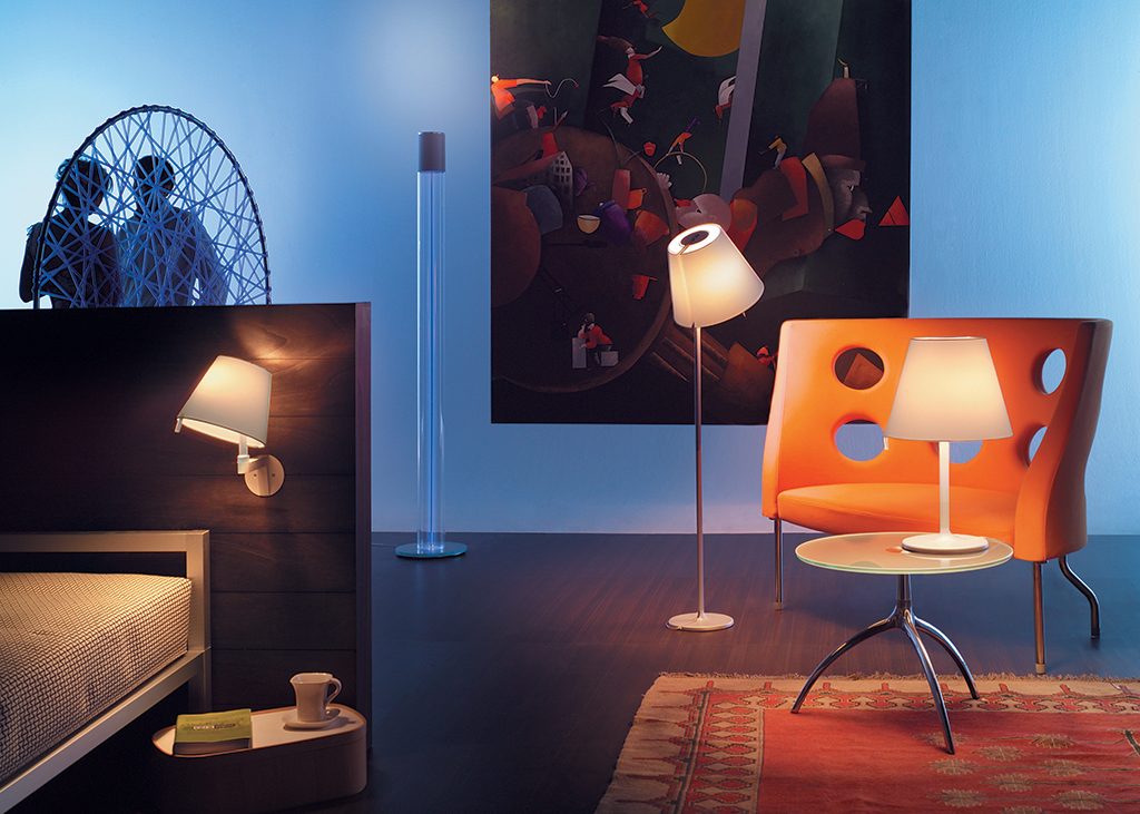 A silk satin fabric shade connected to a painted zamac base via a painted aluminum stem. Melampo can be adjusted for direct and indirect light.