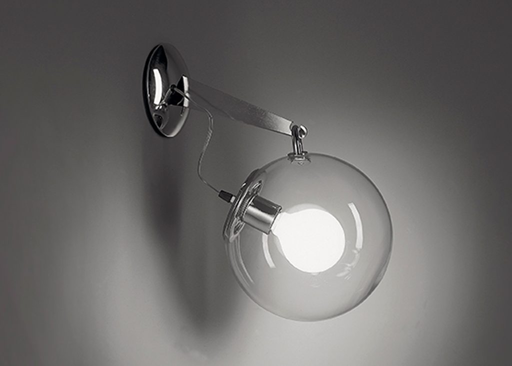 A hand-blown glass globe of light on a base and stem of polished chrome. Transparent yet created a softly diffused, dimmable light.