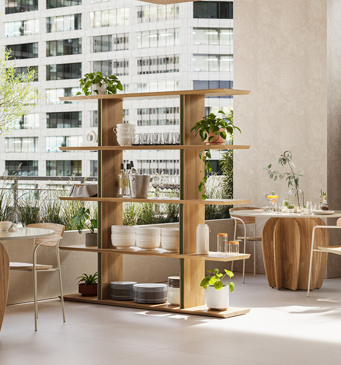 A collection of tables with a solid appearance and exquisite detail both in the tabletop and in the trestle-like grooved legs. Table supported by adjustable feet.