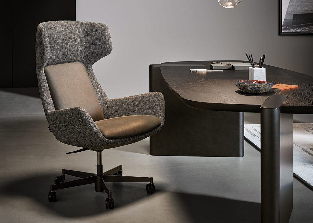 The Newton office armchair is immediately impressive thanks to its imposing seat, which offers all-enveloping comfort, resulting from the high backrest and the wide and comfortable shell. In addition to offering maximum comfort, essential for prolonged use of the armchair in work environments, the high backrest makes it elegant and perfect for the business world, where it can be placed within an executive or presidential context. Newton is upholstered in either a single-material version in leather or fabric, or in a double-covering version in which the seat is in fabric and the front cushions are available in leather. The swivel base has five supports on wheels. The Newton low office armchair is part of the Newton family and as such it can be combined to complement an executive office as a guest seat, while also being perfect as an independent element in modern and elegant office and living spaces.