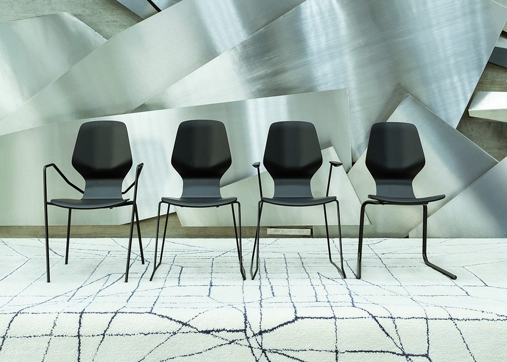 This derivation of Oblique family, regardless to the difference in technology and typology from its upholstered siblings, retains the characteristic S shaped profile of the chair. Strong curvature of the shell provides good ergonomics which is further highlighted by the elasticity obtained from this geometry. The shell is made of 2D molded plywood, combined with 6 versions of steel legs of which 4 are stackable, and one solid wood base.