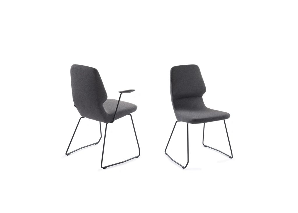 The basis of the system is the characteristic profile of a chair which, defined by two triangular prisms, ensures maximum foam thickness on the rear of the seat and the backseat's lumbar area. The metal is bent at a specified geometry and is upholstered with the moulded foam, resultis in a unified pulsating form. As a result of the triangulation, the solid oak legs thin towards the bottom, thus transforming the square cross-section of the top of the legs into their bases' triangle. Oblique chair with metal construction of the legs emphasizes the specific profile and volume of the armchair, this losing the impression of massiveness that the armchair has in the wooden version.