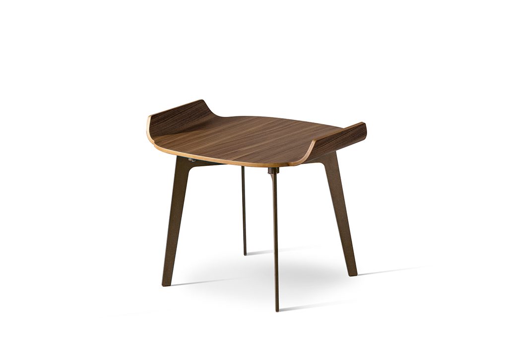 The Olos bedside table continues with the contemporary elegance and purity of form that is the hallmark of the other elements of the collection. In its formal simplicity, the curved wood gives the top of the bedside table a sense of sophistication and lightness while the whole piece is supported by long slender metal legs that raise the top and give character to the outline.