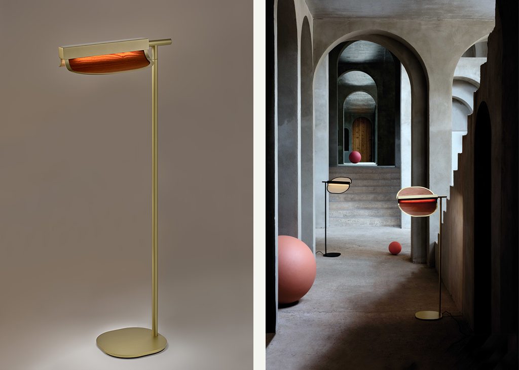 Omma is an inventive lamp, like a tree with fluttering leaves full of light. In Eli Gutierrez’s prepossessing design, it is almost possible to imagine the lamp’s movable wood veneer, artfully edged with metal, flapping in a gentle breeze.