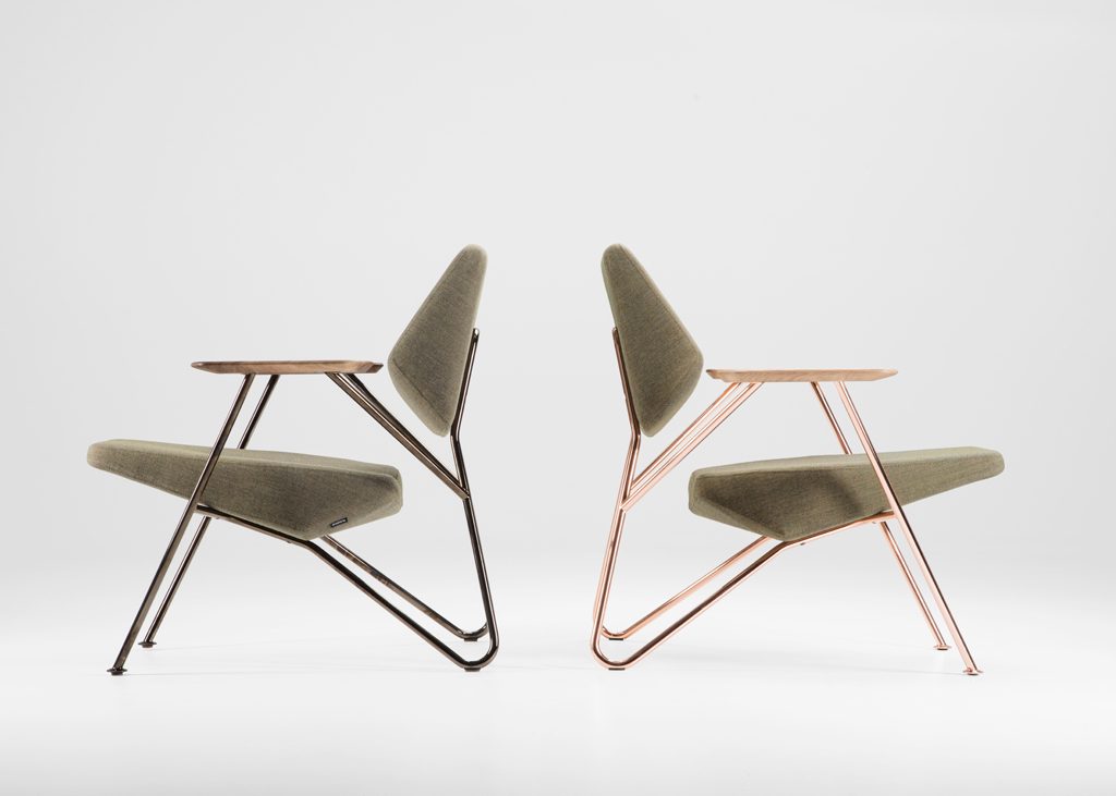 Polygon retains all traditional elements of a modernist chair, but deconstructs them, creating new relations between them. The form of the bent steel bars of the structure, the seat and the backrest are coordinated via a triangular geometry. The composition of the triangle is accentuated when viewed from the side, but once the observer begins to move, these forms transform into hexagons and more complex polygons. We have continued to develop Polygon in close cooperation with prostoria, and have launched a new version of the chair that retains all features of the original design, but in an improved form. The resulting product has a somewhat defamiliarizing effect, seeming both familiar and distinctly contemporary.
