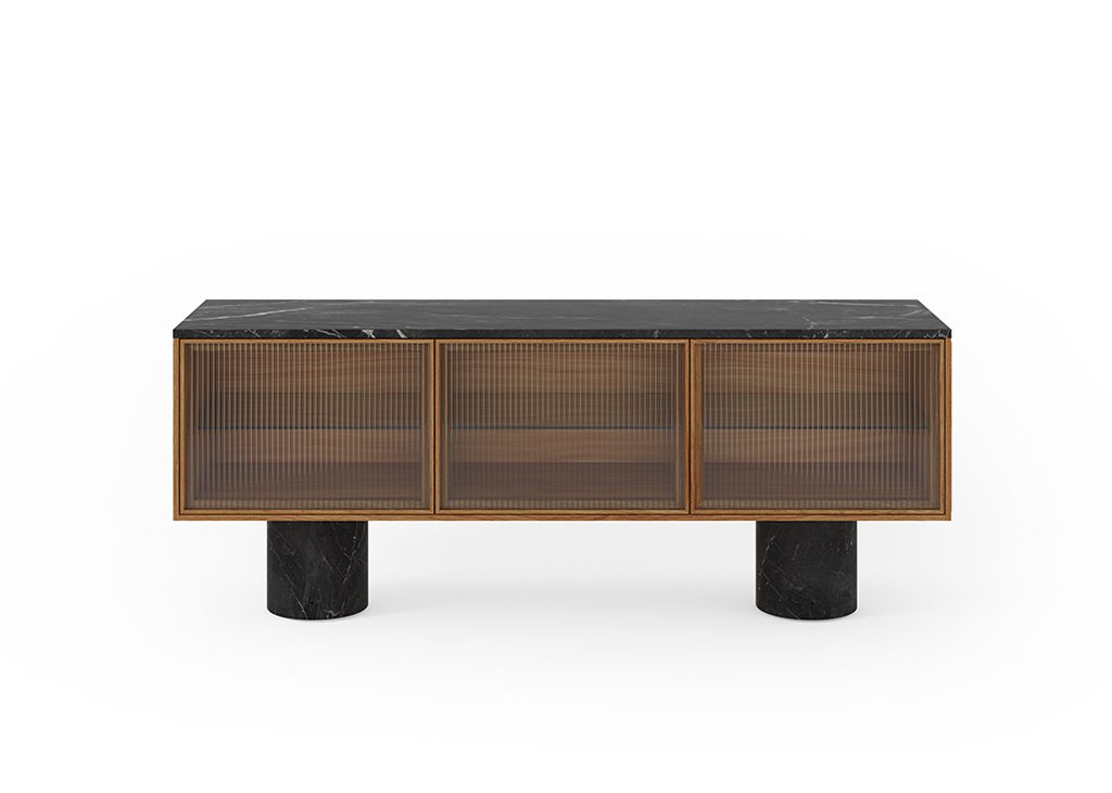The Rio collection is based on my fundamental design language working with honest materials and local craftsmen to achieve unique designs. For Punt I selected solid wood, structured glass, marble, textile and brass to create a collection of cabinets and lamps. Rio is about the balance of materials and the balance of proportions. The Rio cabinets have in common that they are all placed on solid marble cylinders. They provide stability and grandeur in contrast to the precise and fine crafted cabinets on top. Thin wooden frames and push to open doors with different inlays like structured wood are kind of bridge the two pedestals. The dialogue between all components creates a sophisticated character.