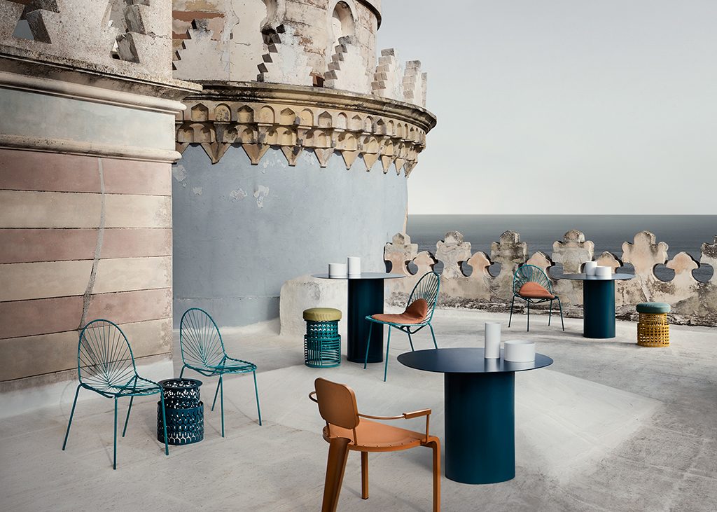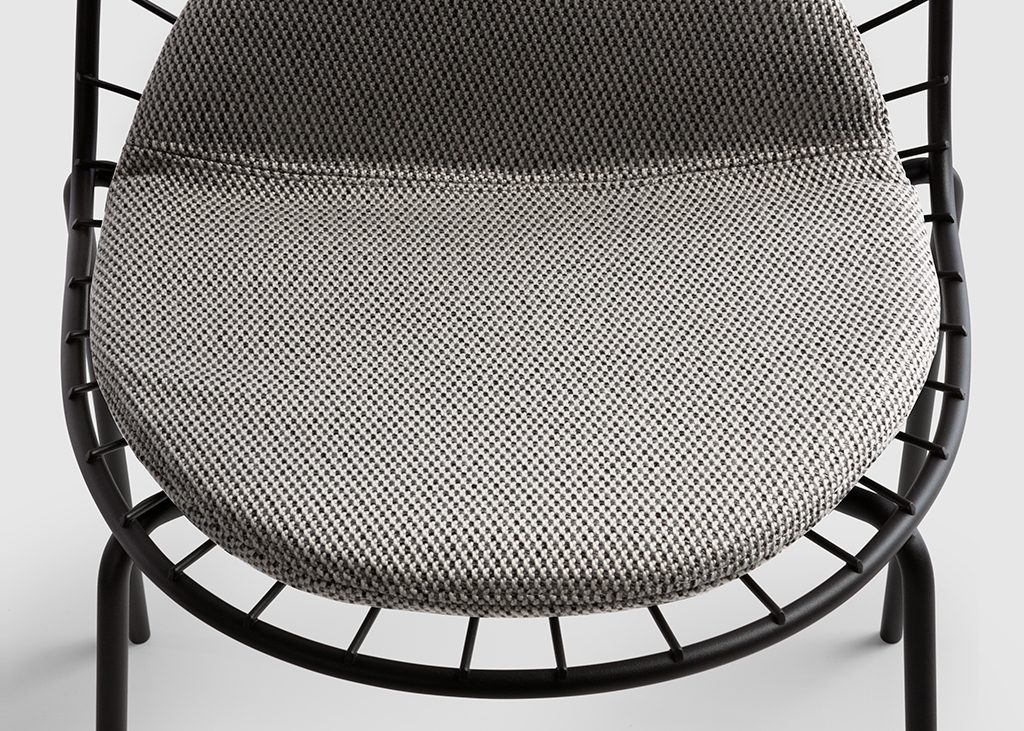 Sen-su, indoor – outdoor chair, metal frame, metal rod seat and backrest. In the photo, from the left, light blue 5024, grey 7022 and white 9016 finishes with tikal green trim. Also available in black 7021, dove grey 7006, mars, green 2100, sand grey 2800 and red 3004.