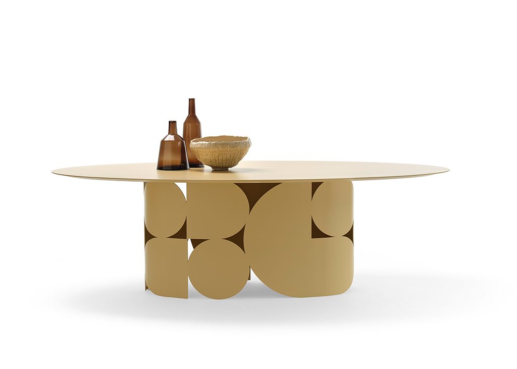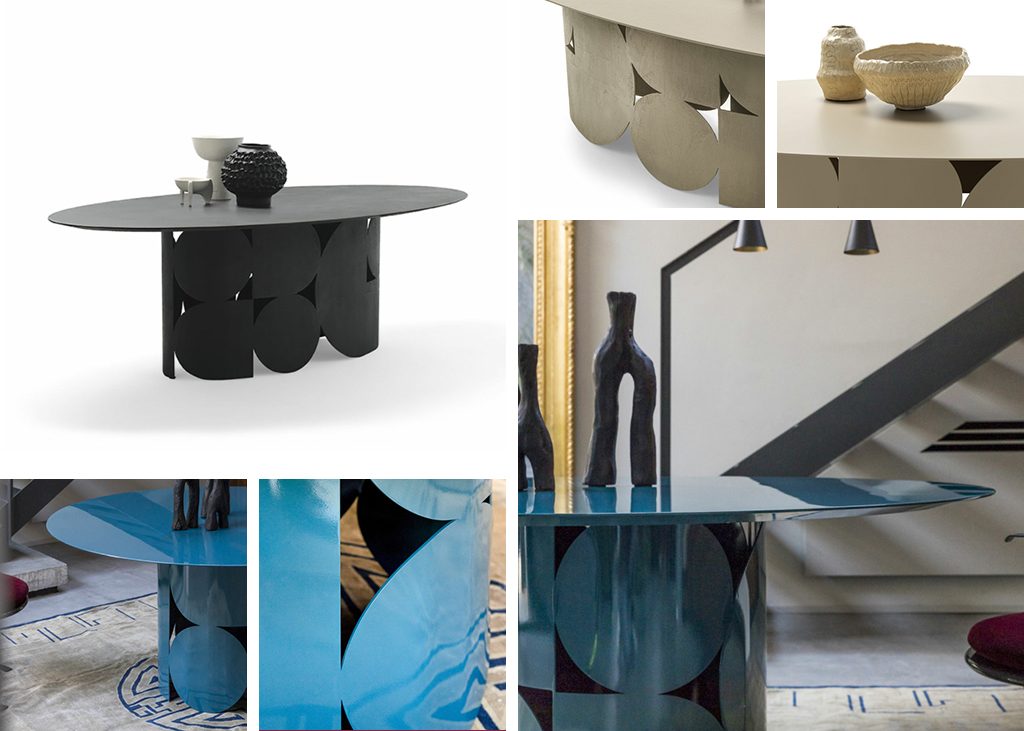 Table with perforated metal base and wooden top. Available in the finishes: matt or glossy lacquered in all the colors as per the samples or textured hand-brushed in the colors as per the samples. Aesthetic balance between top and central leg furnishes the living room with strong personality.