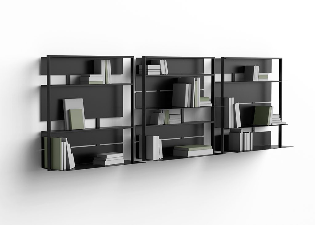 The basic structural module is a square that is applied on the wall as a visually autonomous object. However, to make the system adaptable to various ambiences and intended purposes, several modules with different proportions have been developed as well as freestanding variants. L-cross-section shelves are inserted in the structural module; they come in 4 different formats and can be used together with the rear part mounted upward or downward. Shelf is made out of aluminium to achieve lightweightness.