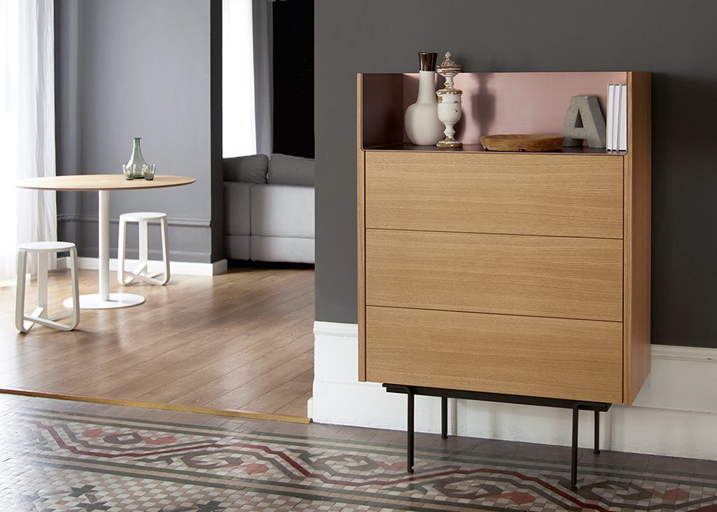 A collection of sideboards, chests of drawers and TV benches, winner of the Red Dot 2015 Award, with a singular aluminium finish on the top surface. A piece of furniture leaning on a plinth, on adjustable feet or hanging from optional wall-fixing devices. The door elements include a height-adjustable shelf. Optional cable outlets.