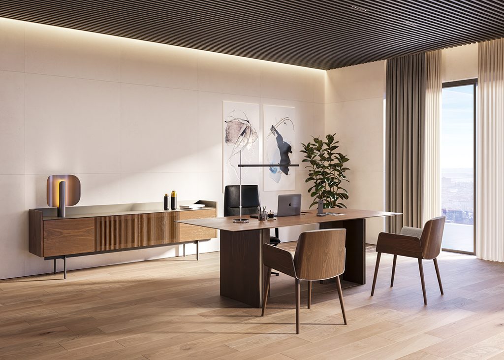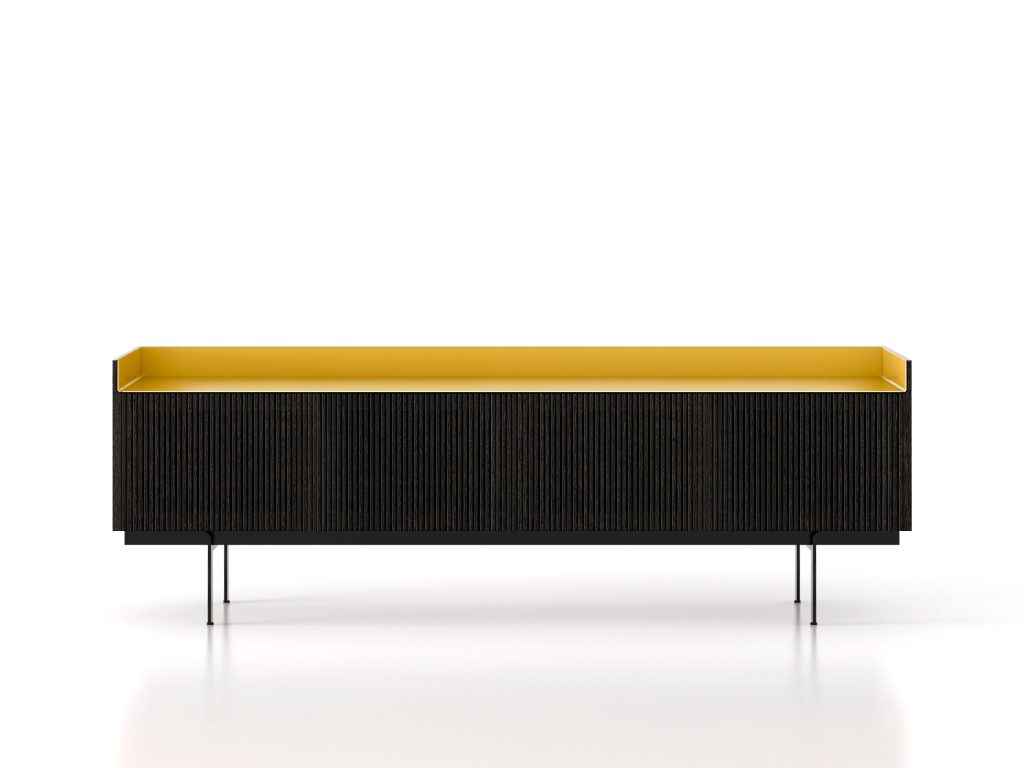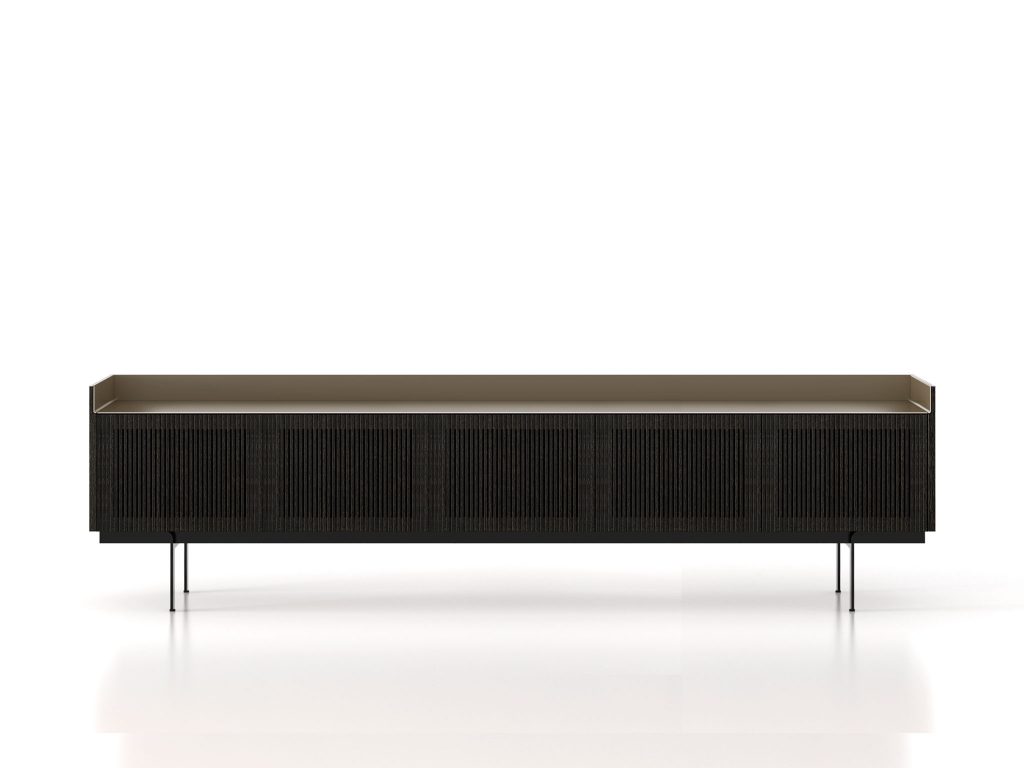 A collection of sideboards, chests of drawers and TV benches, winner of the Red Dot 2015 Award, with a singular aluminium finish on the top surface. A piece of furniture leaning on a plinth, on adjustable feet or hanging from optional wall-fixing devices.