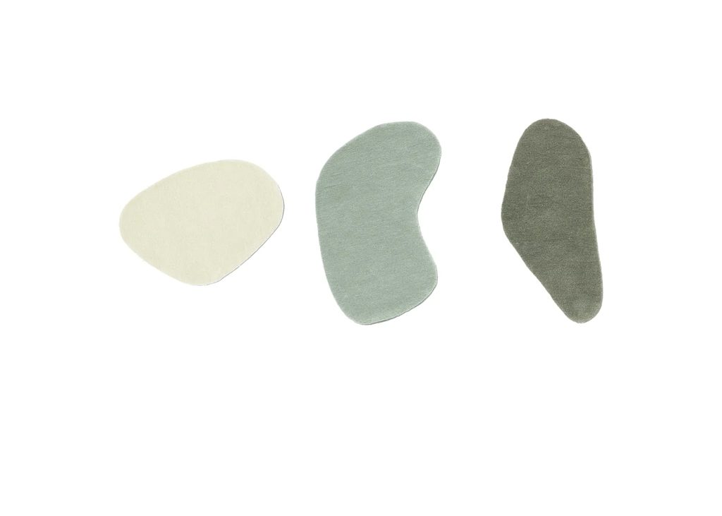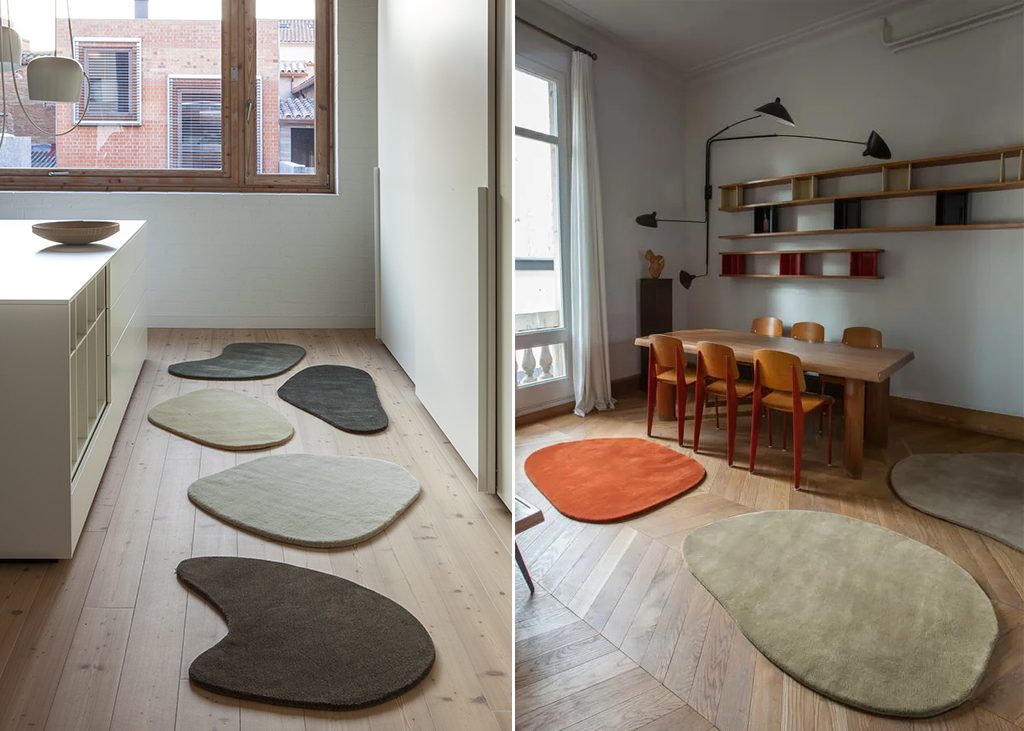 The rugs in the “Stone-wool” collection create a riverbed of smooth pebbles that adapt to long corridors. The irregular contours and colours offer myriad combinations for interiors, acting as stepping-stones for an imaginary stream.