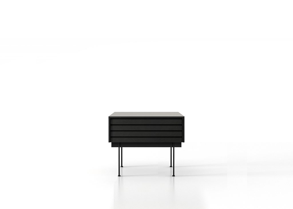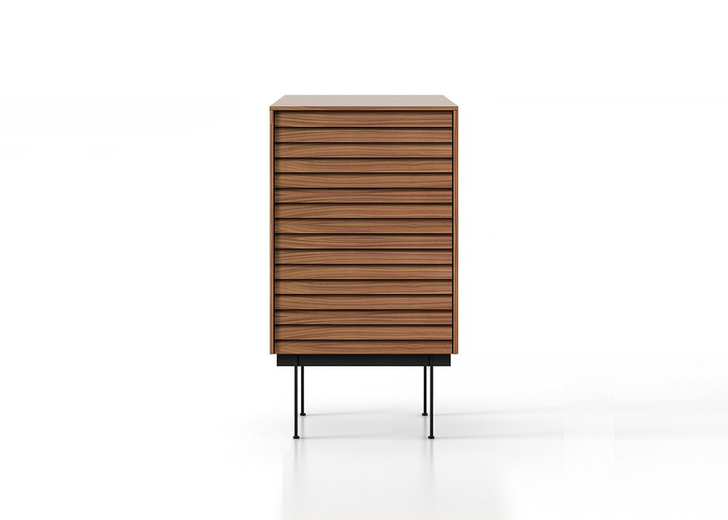 A collection of sideboards and TV benches with an exclusive design on the front consisting of horizontal bars hiding the composition besides serving as handles for doors and drawers. A piece of furniture resting on a plinth, on adjustable feet or hanging from optional wall-fixing devices. The door elements include a height-adjustable shelf.