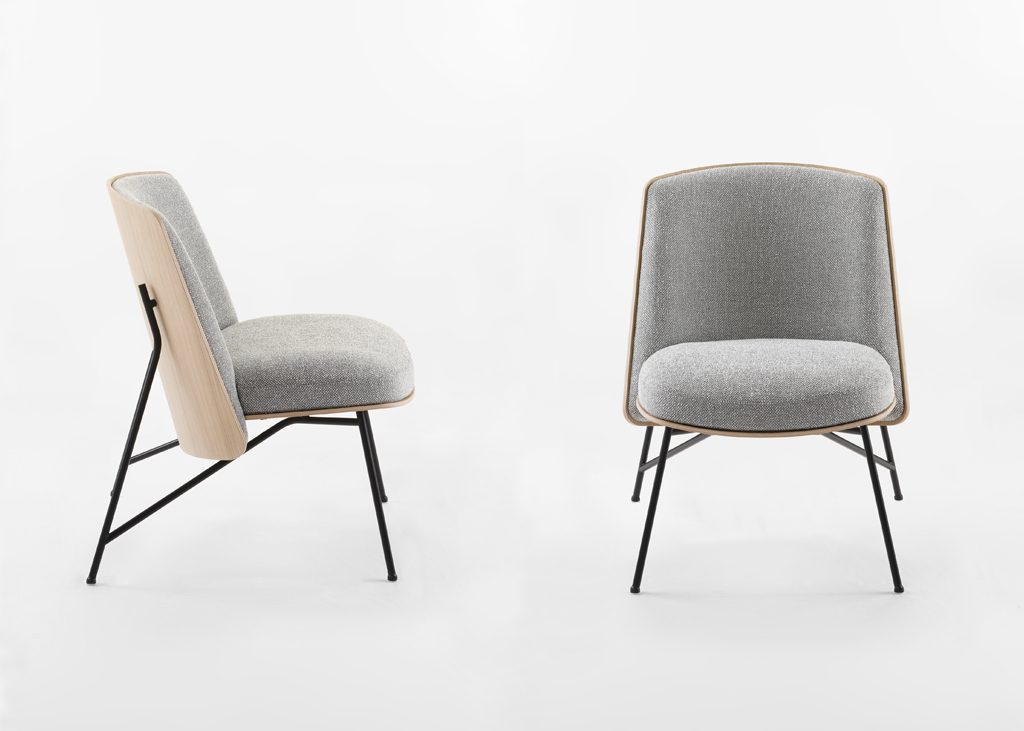 Designed to be inviting, Tinker is conducive to comfortable sitting and relaxed work by a mid-high table. Its form highlights the plywood backrest and the seat shell, upholstered in fabrics. In terms of typology, Tinker lies between a chair and easy chair. Therefore, the seating cushion is intentionally softer, accentuating the feeling of cosiness and luxury, also achieved through its overall ergonomics. The slim steel legs keep the base “afloat”, and they are available in diverse coating finishes.