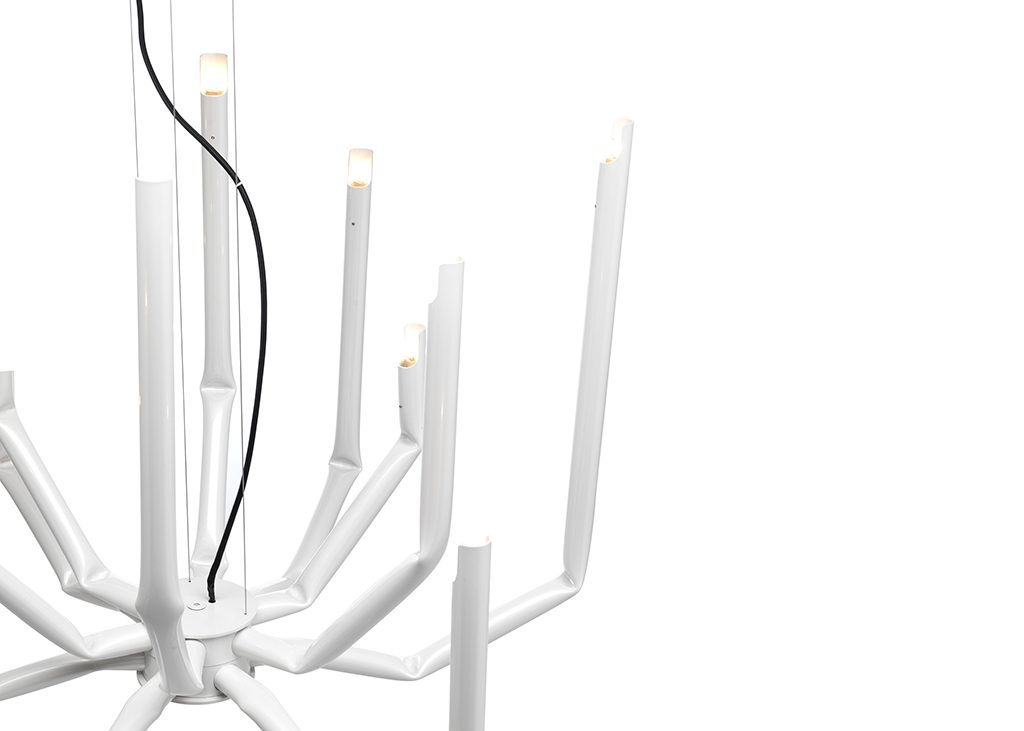 To_Be is a suspension lamp designed by Studio 14 for the brand Mogg, made of iron pipes mechanically bended with 6, 12 or 18 LED lamps with mat bronze or white finish. Electrical and steel cables are 2,5 mt lenght and the roundel is white varnished. Available in two finishes and three dimensions, To_Be is a mechanical chandelier with a strong industrial inspiration, derived from a crushed pipe and deformed by the mechanical bending, laser cutting and welding.