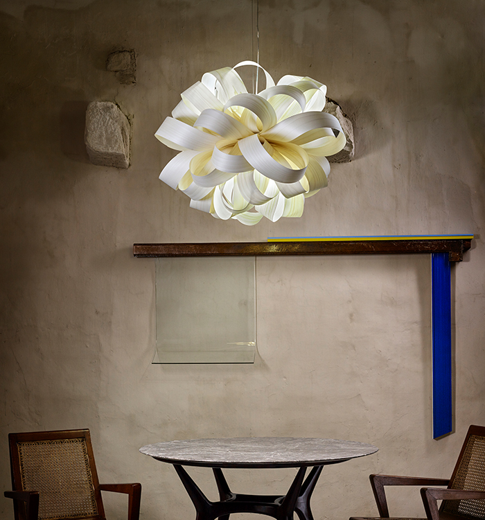 Tomo is presented as a chain of wood veneer oblongs, with varying heights and widths. The resulting shapes are both graphic and geometric in form. Tomo is designed as a table lamp and a suspension lamp, with dimmable LED, and a light-filtering diffuser. As a table lamp, Tomo’s arrangement is evocative of book spines; as a pendant, Tomo appears like an illuminated row of hanging volumes.
