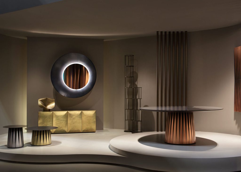 A two-dimensional metal surface becomes three dimensional thanks to hand-crafted processes: folding, hammering, bending, and soldering generate different light diffusers inspired by the complex shapes of conoids, starting from a single outline. Each volume is assigned to a different type of lamps (suspended, table-top), suggesting the ways in which metal offers various interpretations and possibilities. The finishes and the processes used combine to play with the alternation of brushed and oxidised, reflecting light in unexpected ways from piece to piece.