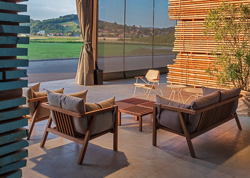 The furniture construction consists of broad and narrow wooden slats of a square cross section that create a recognizable graphism in the design. Rich, sumptuous cushions create the visual identity of the entire collection. Modular nature of the Umomoku collection allows the users to combine multiple elements according to need, but also their individual use, both in the exterior and interior. It consists of an armchair, sofa, low table, bench, sunlounger and a tray.