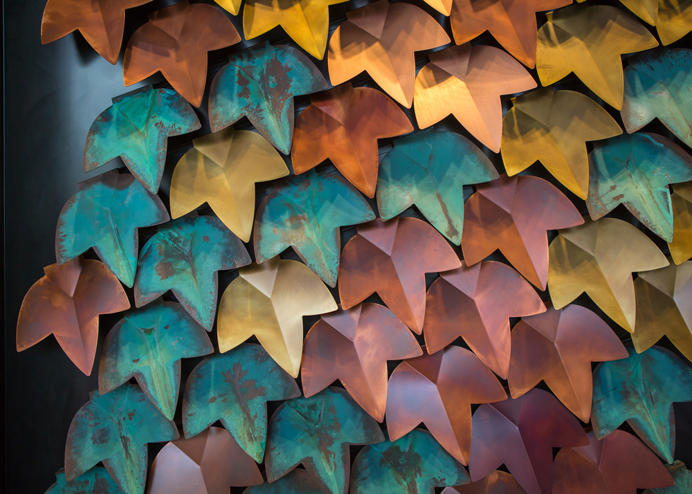 A kind of theatrical “vertical garden” created by De Castelli through the creation of a decorative pattern like American vine leaves, evoking a picturesque autumn scenery warmed by the choice of the material, copper, and its finishing thanks to the precious nuances of a warm palette: from reddish-brown to bronze to green.