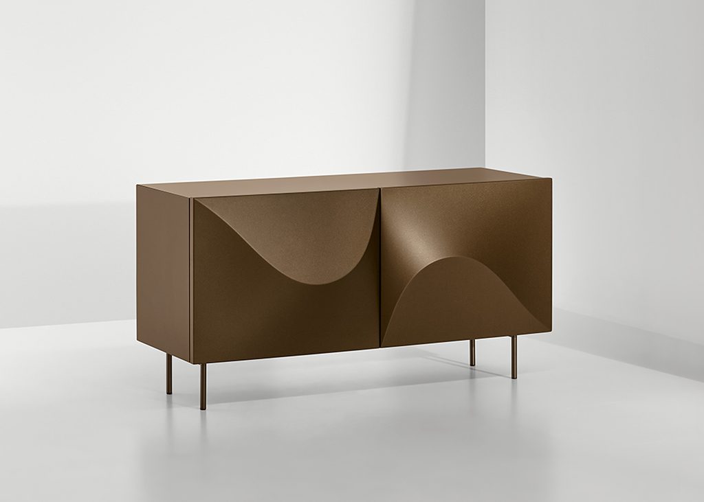 Inspired by the poster for Alfred Hitchcock’s film of the same name, the Vertigo sideboard is distinguished by the soft wave that characterizes the front doors, creating a flow of movement on the surface that softens the rigorous design of the unit. The metal base consists of four seemingly slender feet that give the entire unit a sense of lightness.