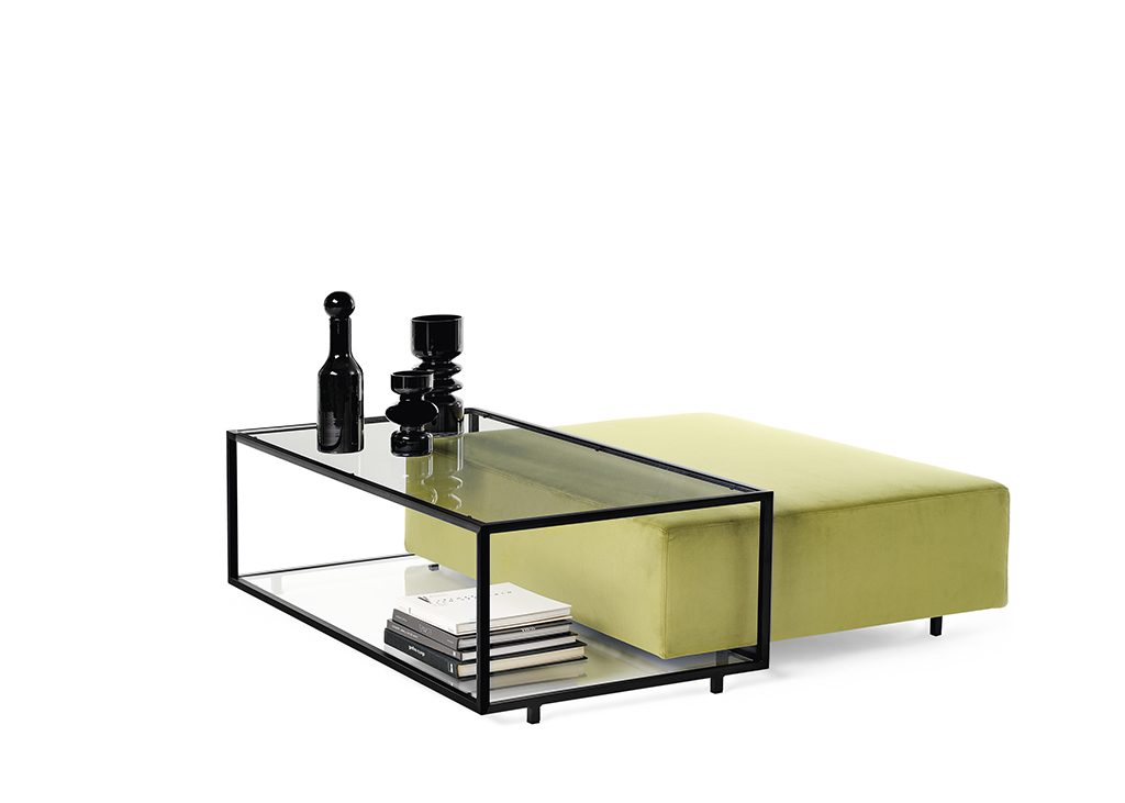 Zoom pouf is padded with removable cover, with coffee table with metal structure available in patinated bronze or black painted finishes complete of transparent glass top. A timeless classic, ideal in the living area as a seat and at the same time as a coffee table.